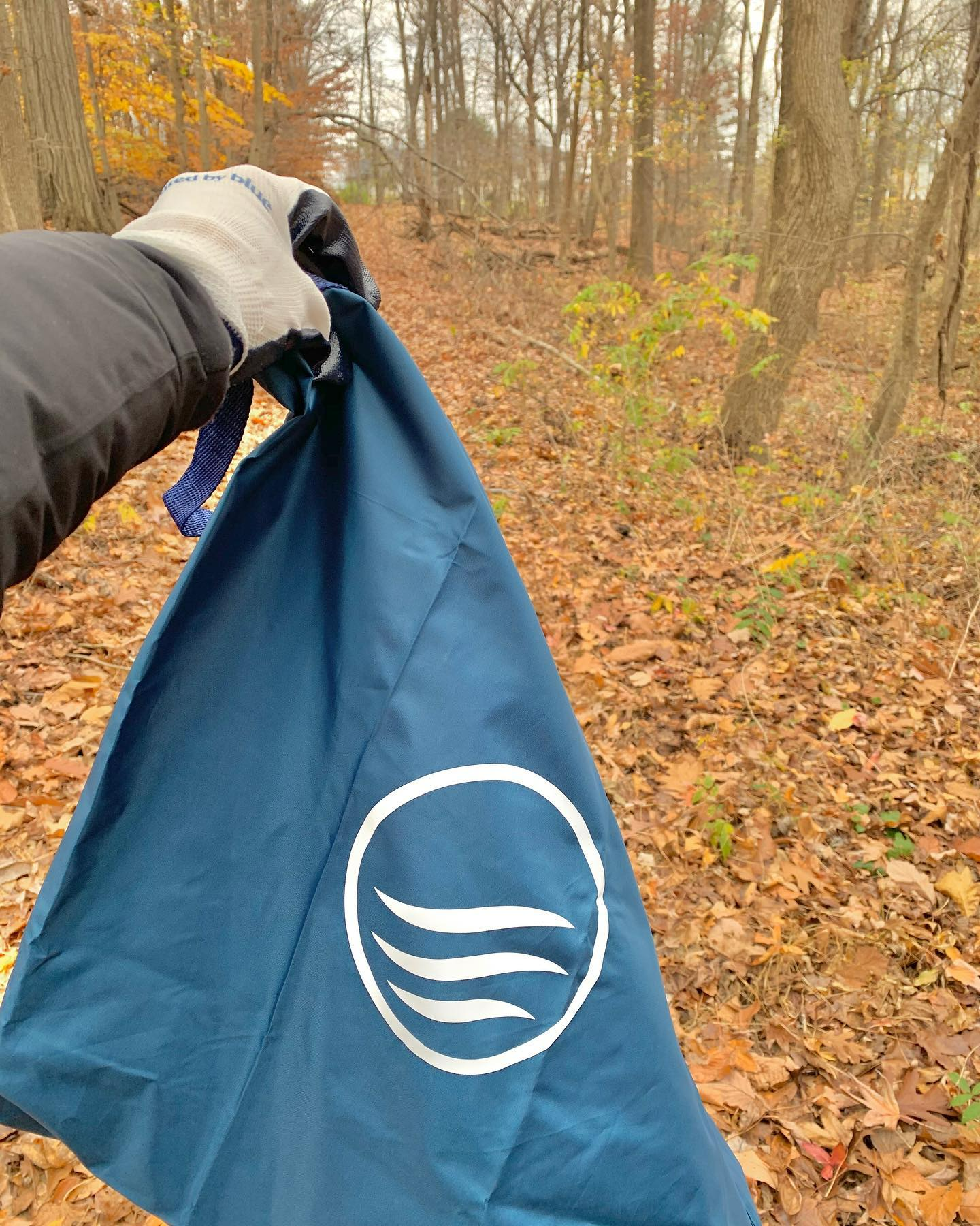 • Bolsa de basura: 100% poliéster reciclado con correas de nailon reciclado, 22" de alto x 20" de ancho.
