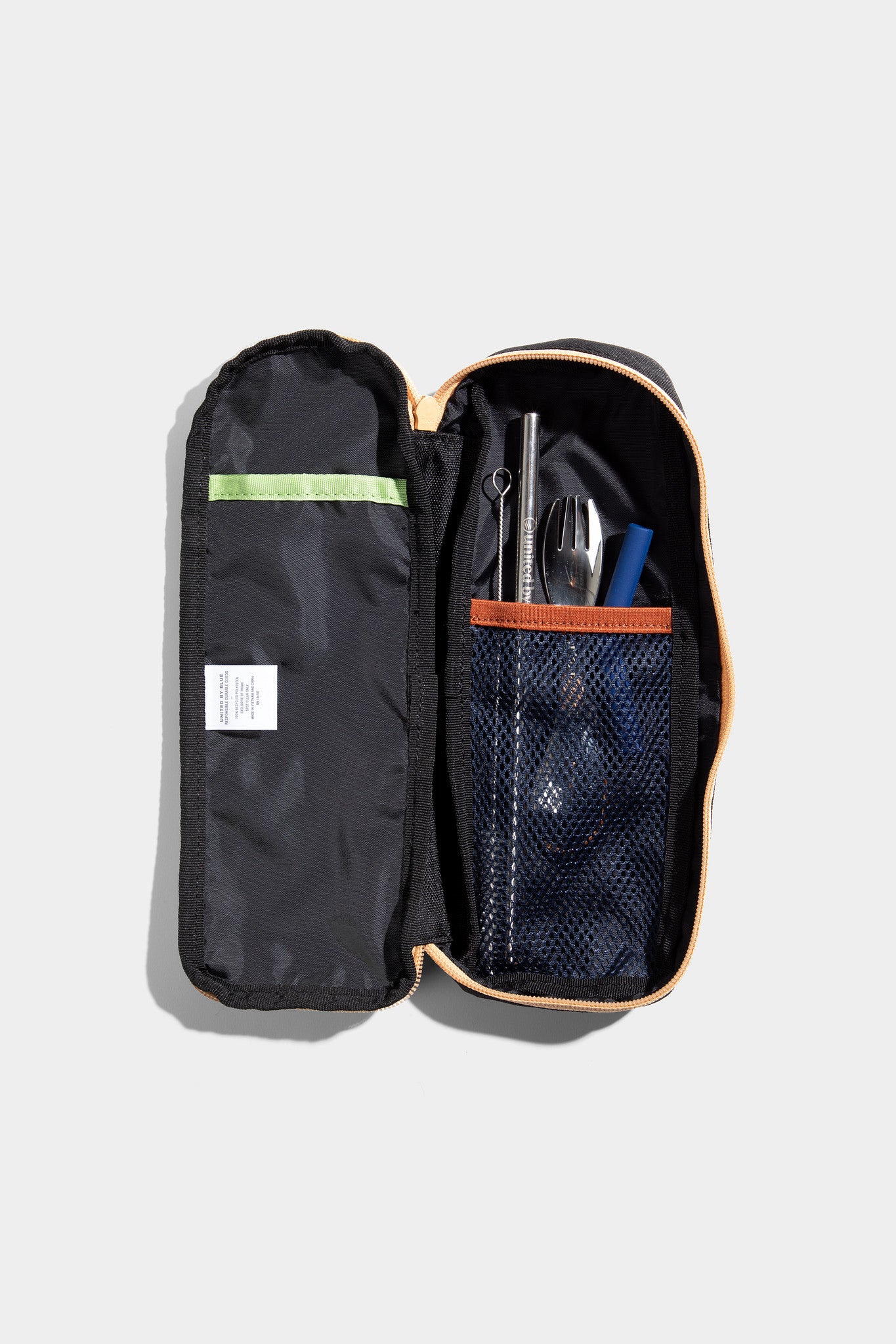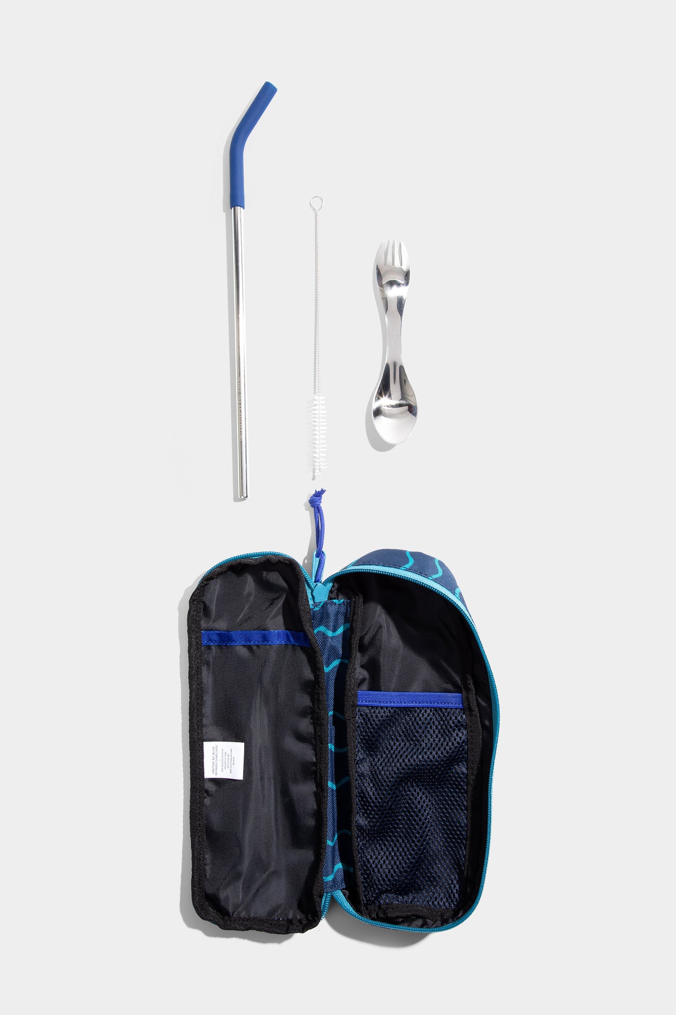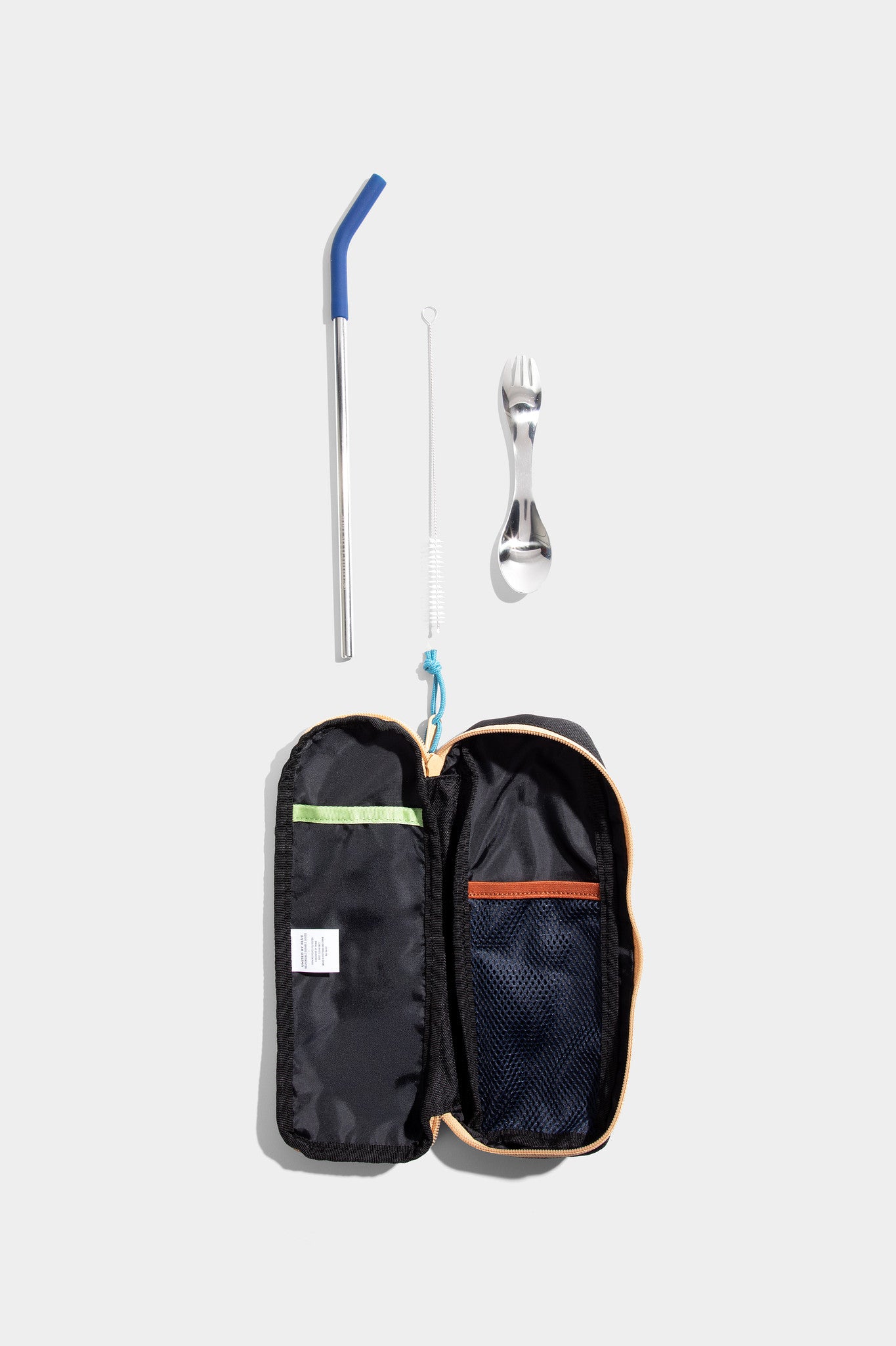¿Plástico de un solo uso para quién? El Utensil Pack es perfectamente portátil y viene con una pajita de acero inoxidable, una punta flexible de silicona, un cepillo para limpiar la pajita y un tenedor-cuchara de acero inoxidable, todo envuelto en un estuche protector de transporte hecho de plástico reciclado.