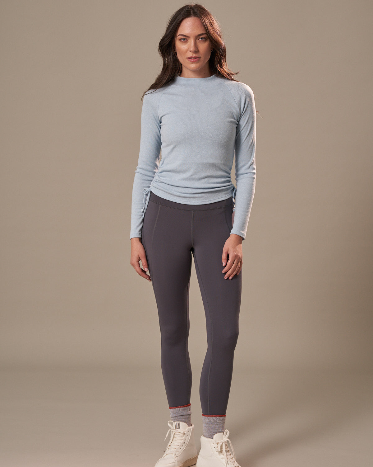 We love an adjustable moment. A cute and sporty mockneck top with cinch ties on the sides so you can customize the fit and length to your liking. Crafted with a comfy and movable blend of recycled polyester, hemp, and a bit of stretch.