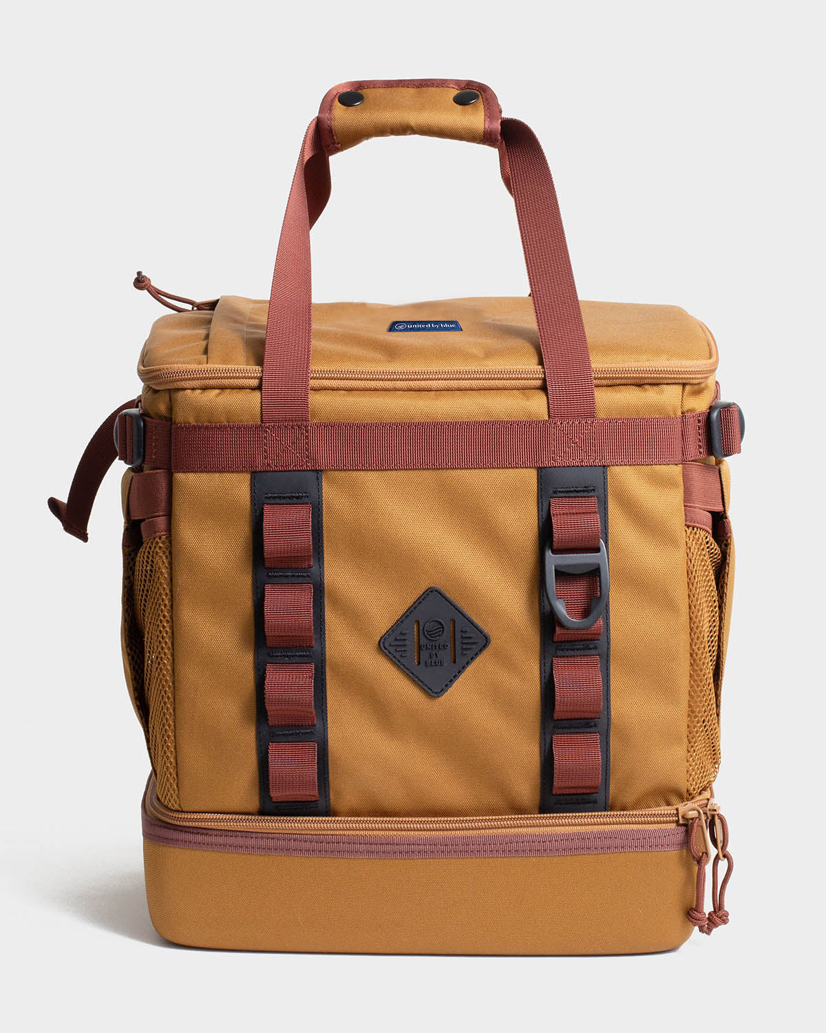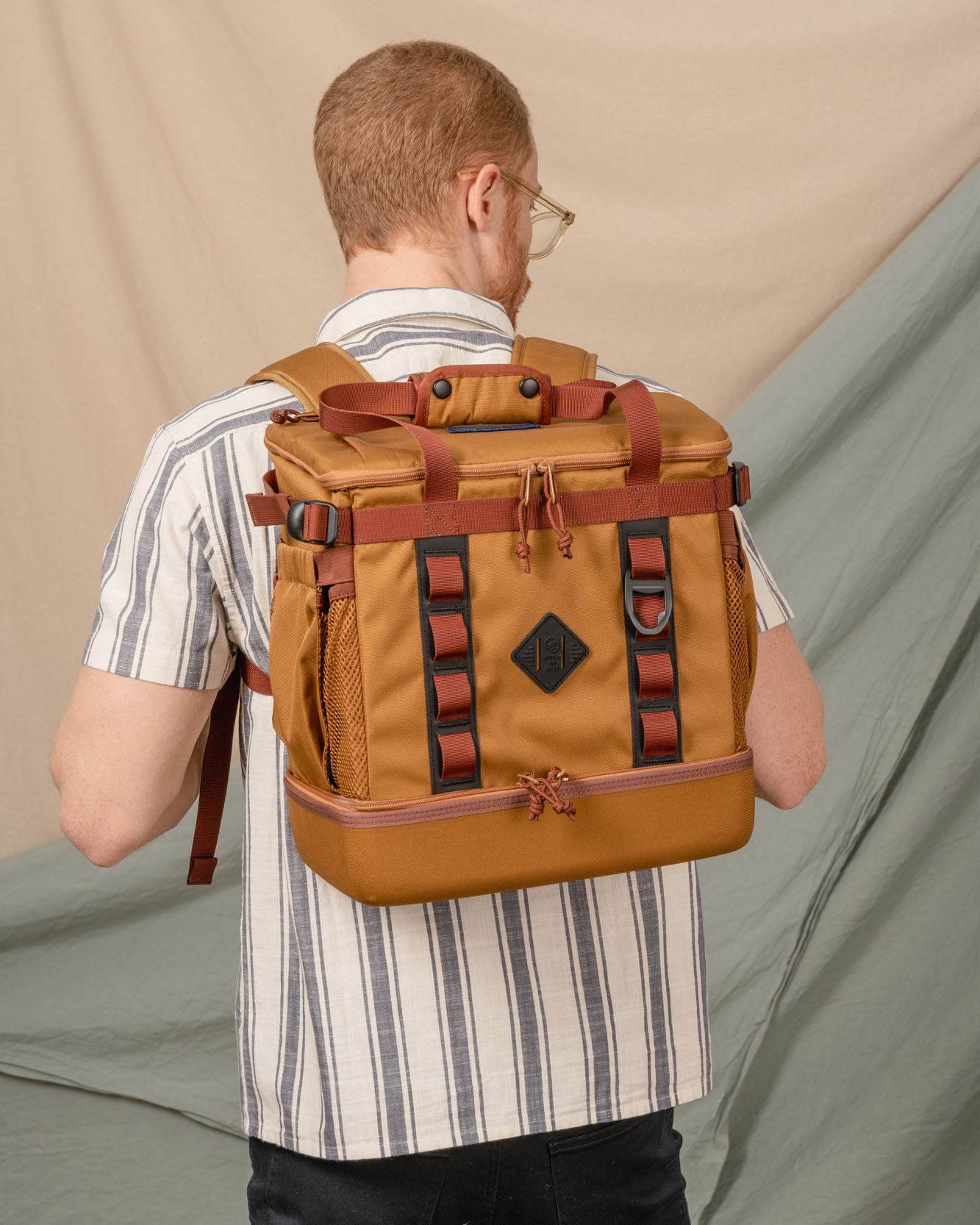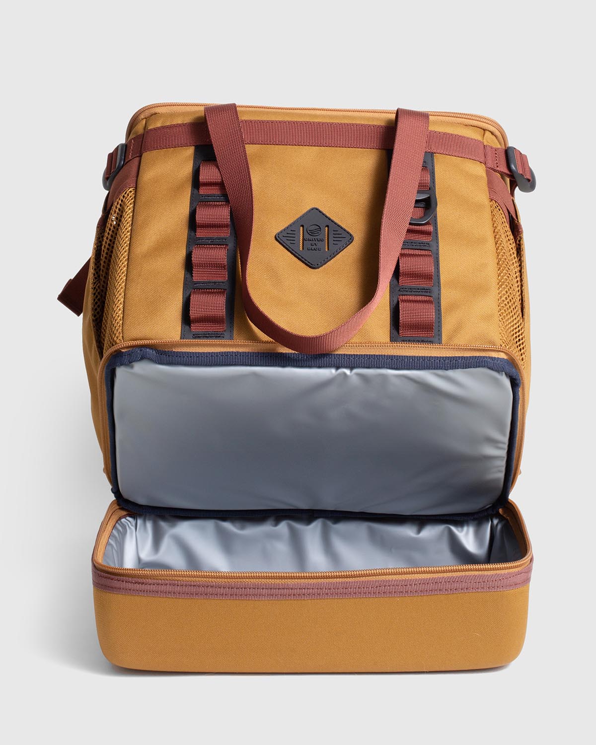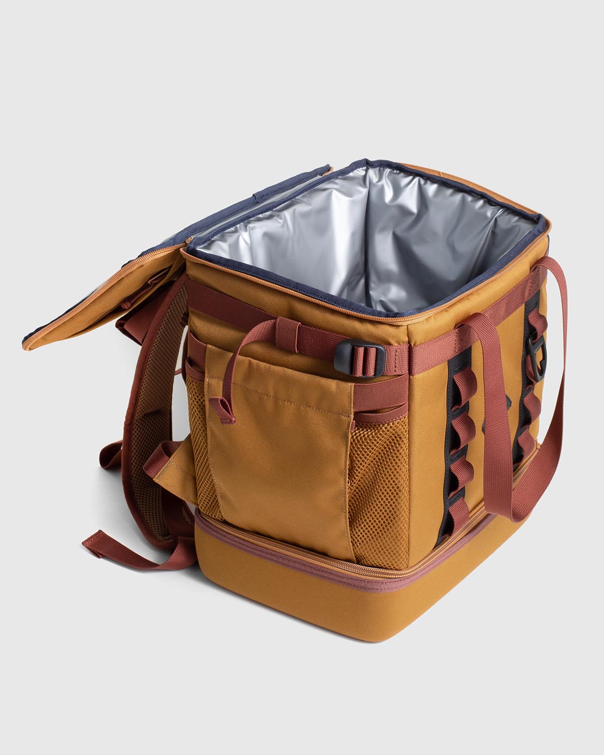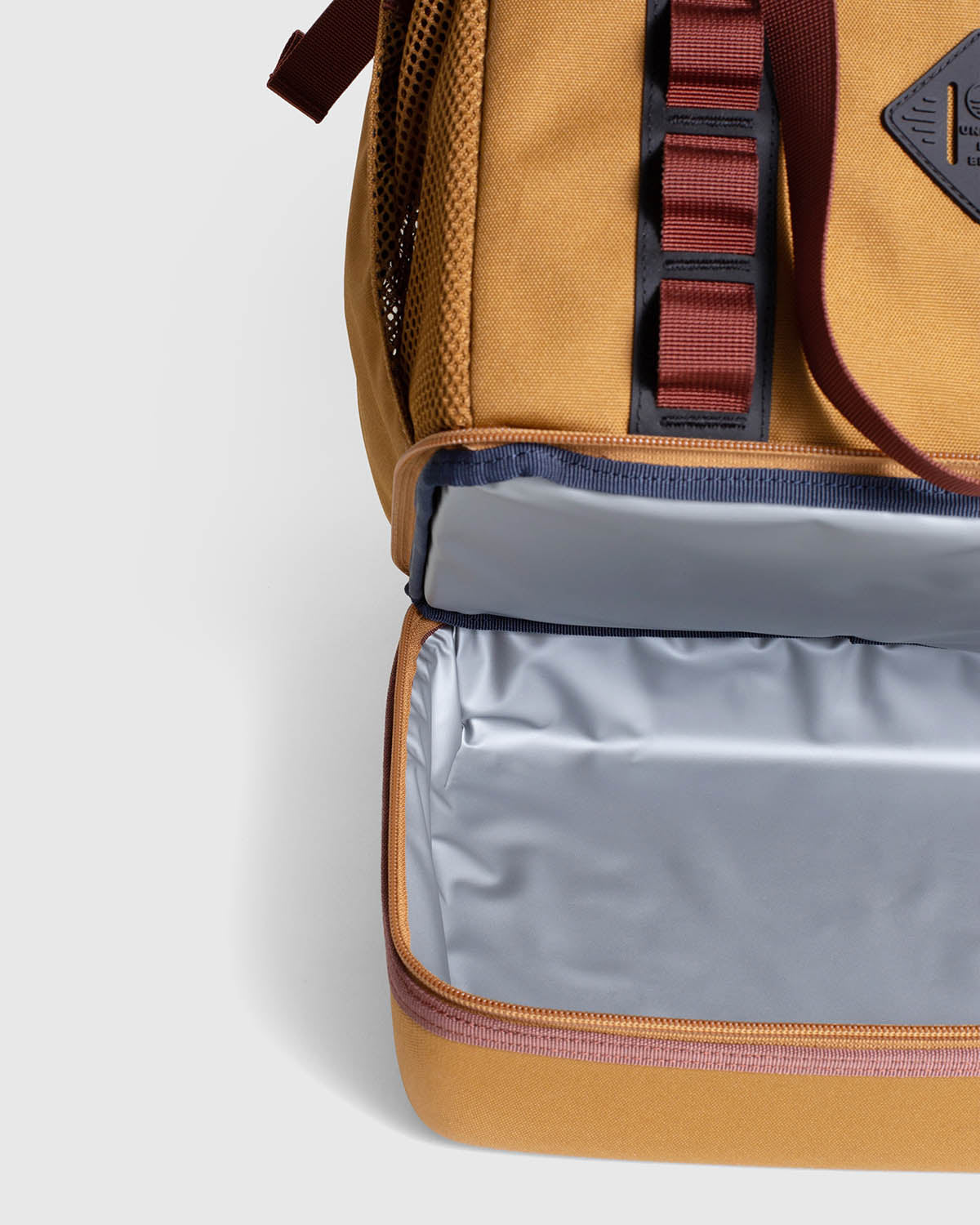 • Cooler backpack with aluminum bottle opener, fixed adjustable shoulder straps, cross sternum strap, upper and lower insulated compartments, top applied pocket on top zip compartment, and expandable pockets on side and exterior.