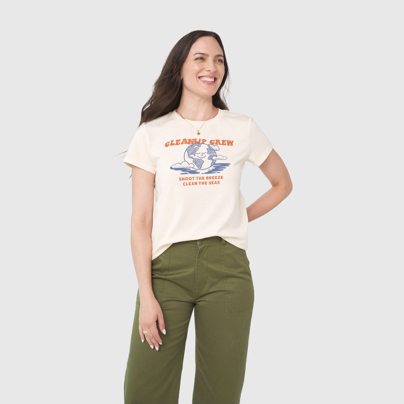 The Earth Dance tee is a women's fit, short-sleeve t-shirt with a crew neckline and front graphic. It’s printed with a water-based ink and crafted from a blend of organic cotton and recycled polyester – a sustainable combination that conserves natural resources, keeps plastic waste out of landfills, and is especially soft to the touch.