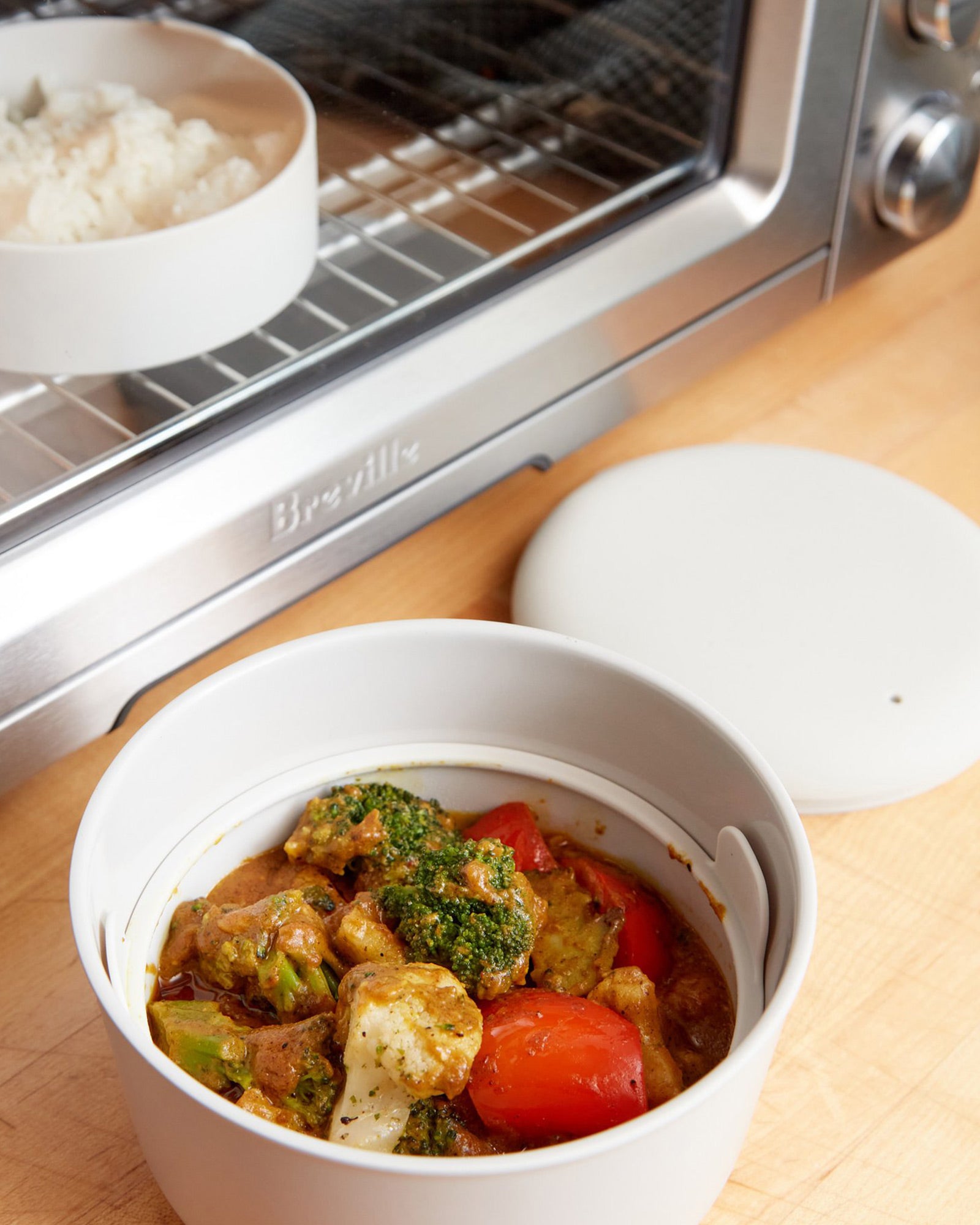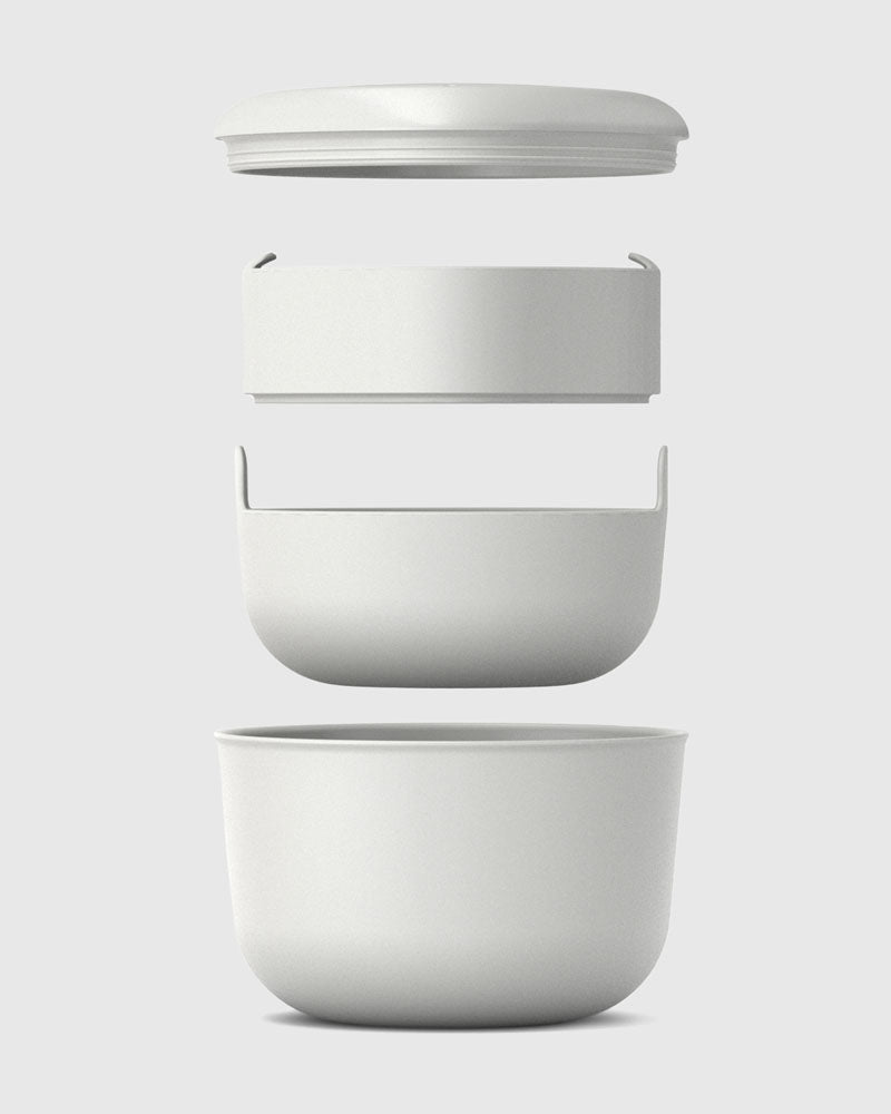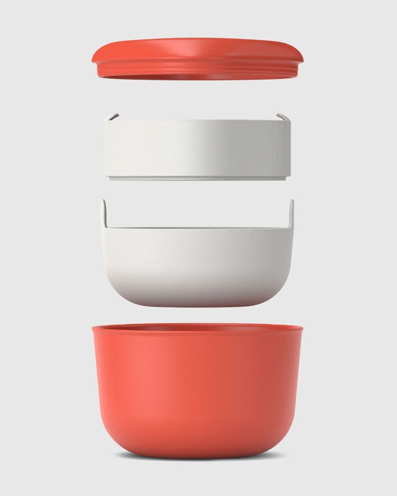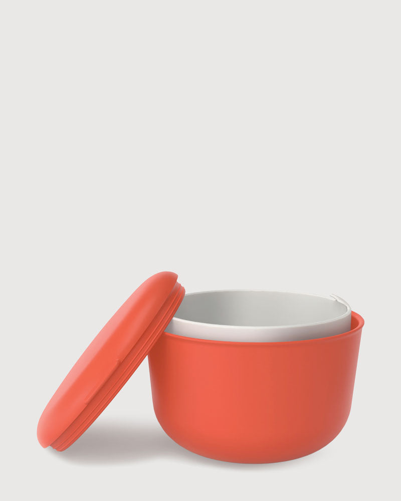 • Reusable bamboo fiber lunch set with two heat-safe silicone inserts