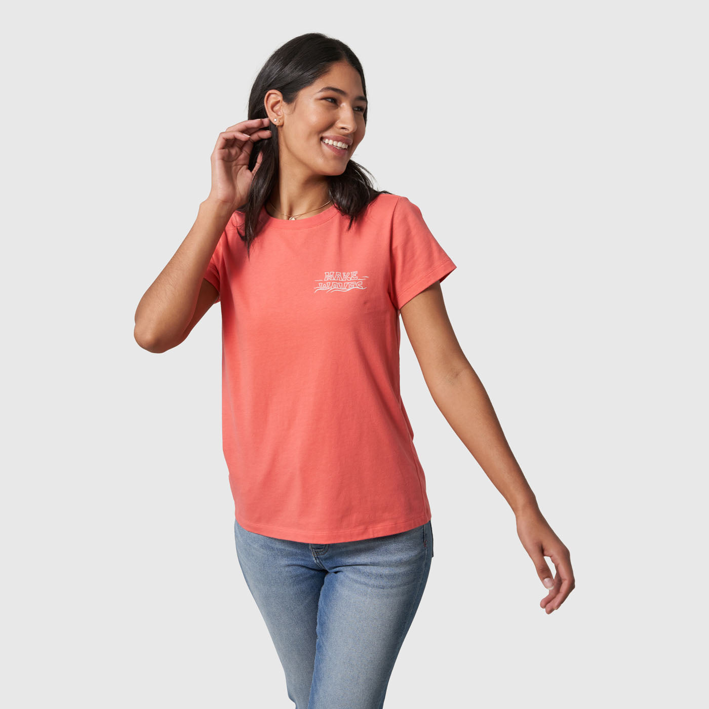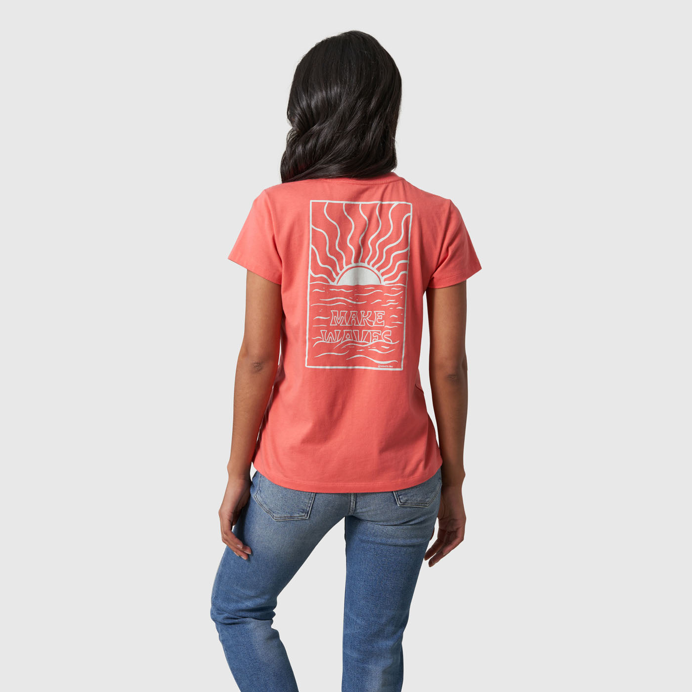 The Make Waves Tee is a women's fit, short-sleeve t-shirt with a crew neckline and front graphic. It’s printed with a water-based ink and crafted from a blend of organic cotton and recycled polyester – a sustainable combination that conserves natural resources, keeps plastic waste out of landfills, and is especially soft to the touch.