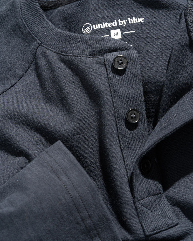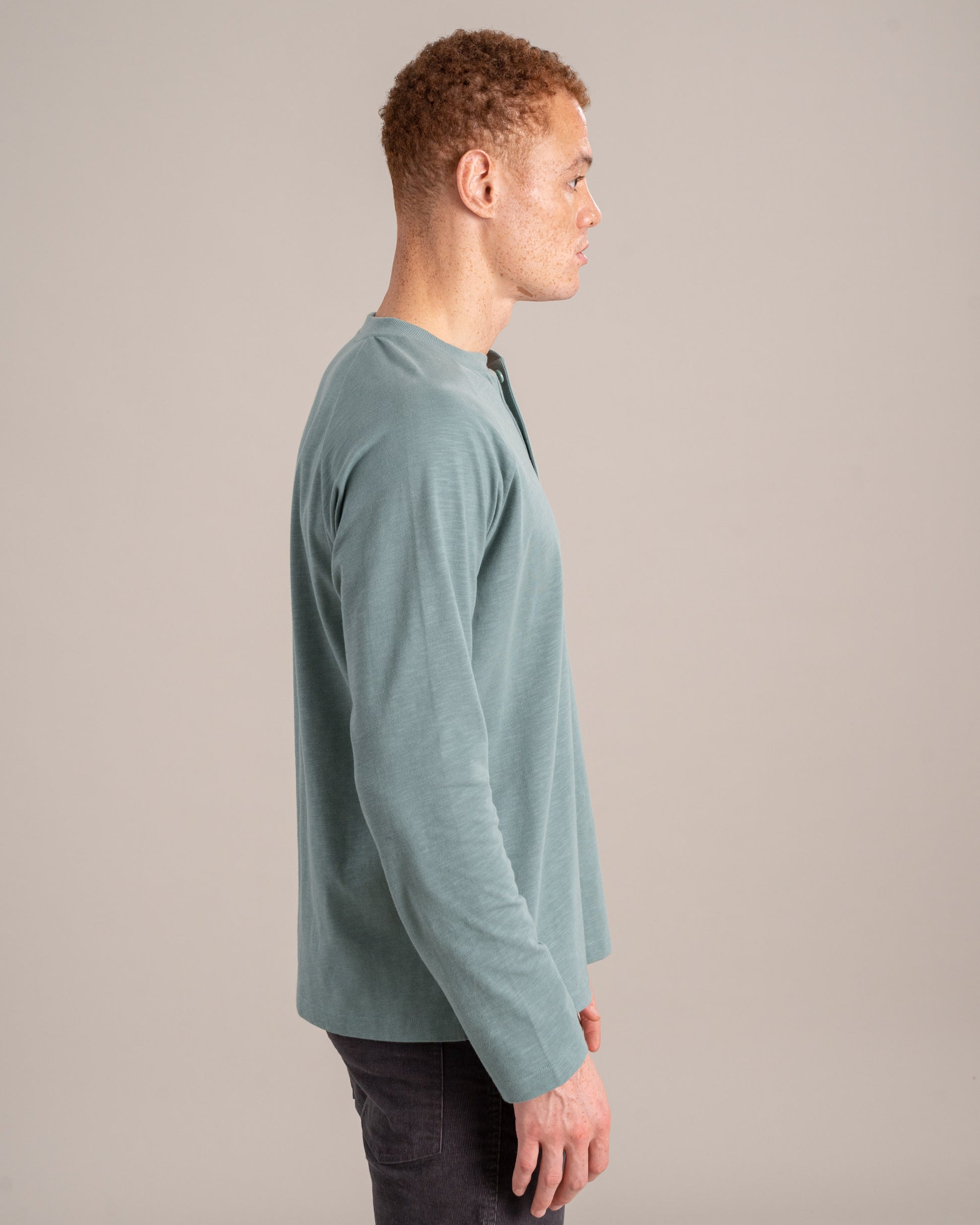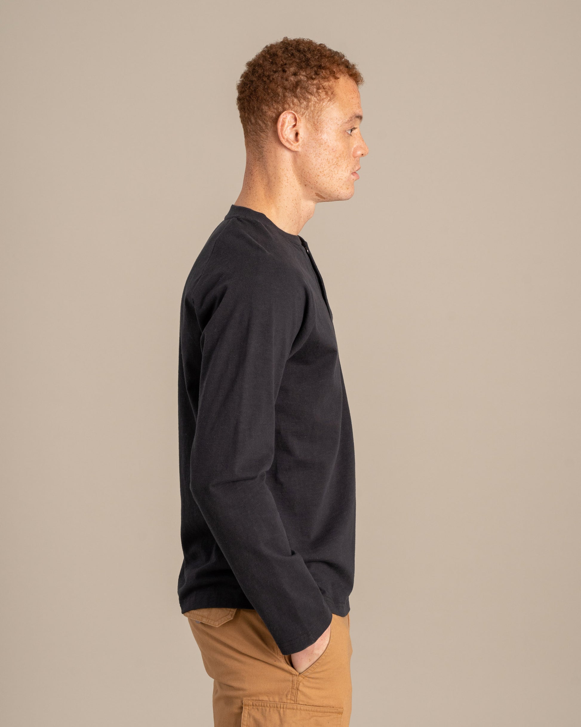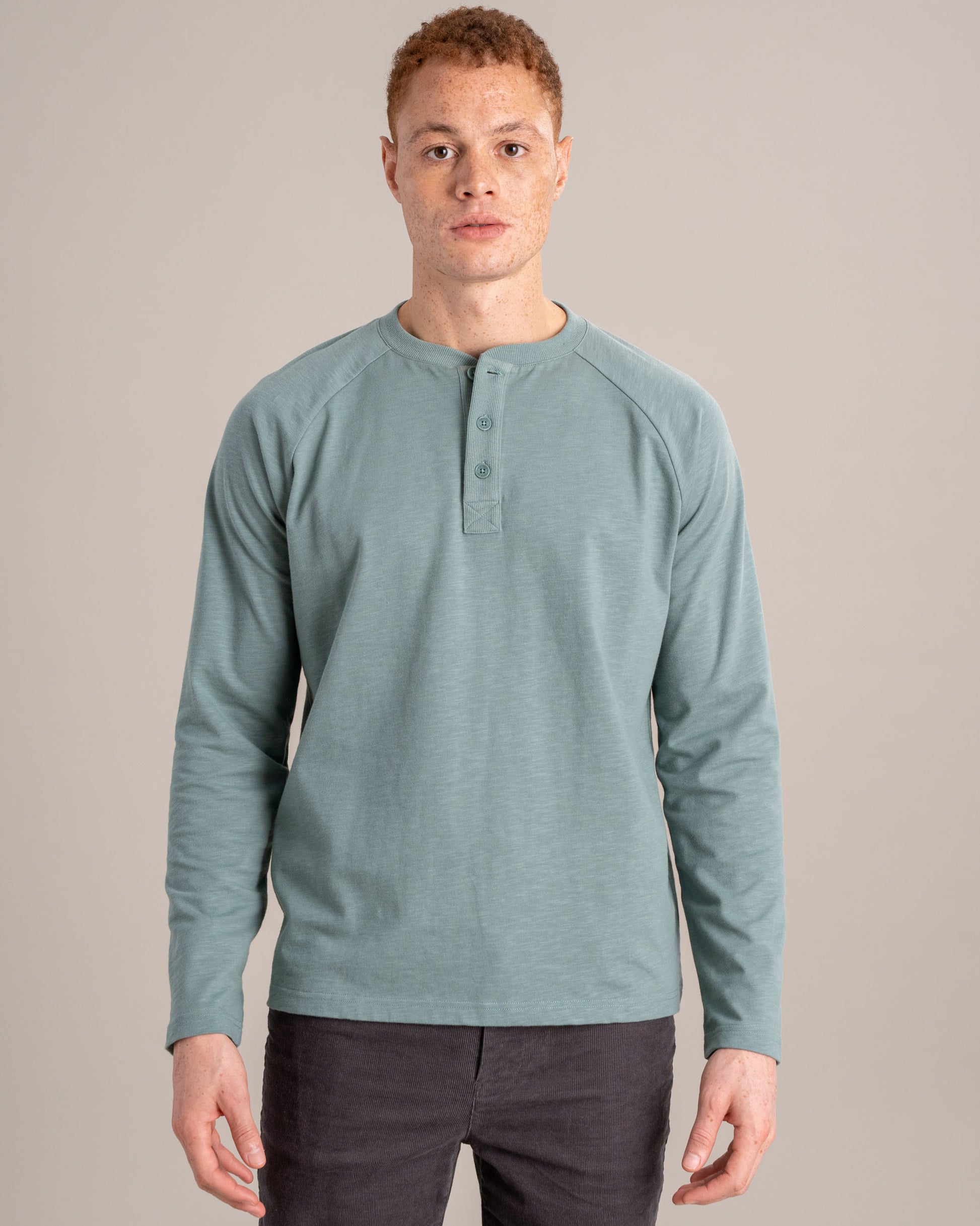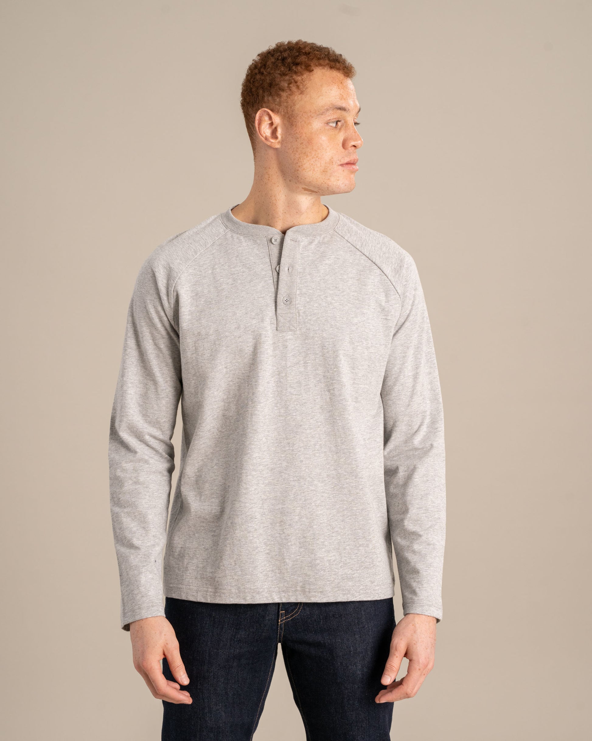 • Long-sleeve henley with ribbed collar, 3 button placket, and straight hemline.