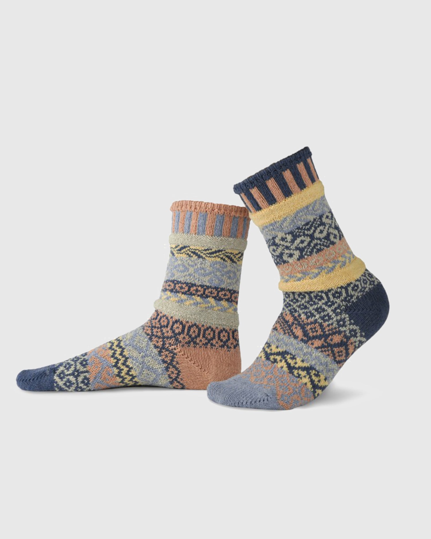 Like the appearance of a sheet of water in a desert or on a hot road, these mismatched Mirage Crew Socks embody beauty and mystique of the same kind. Made from pre-consumer, recycled cotton yarn.