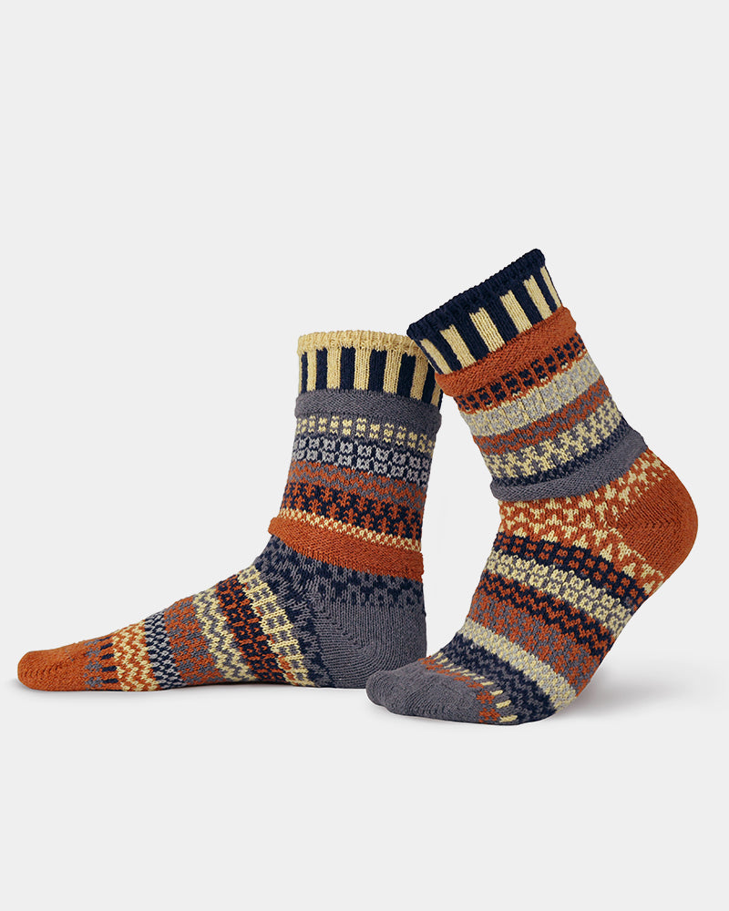 Like the appearance of a sheet of water in a desert or on a hot road, these mismatched Mirage Crew Socks embody beauty and mystique of the same kind. Made from pre-consumer, recycled cotton yarn.