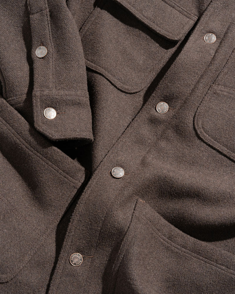 • Chore coat with point collar and shank buttons at center front placket. Workwear pocket at left chest, patch and flap pocket at right chest, and dual patch pockets at side seam. Straight hemline with vent at center back.