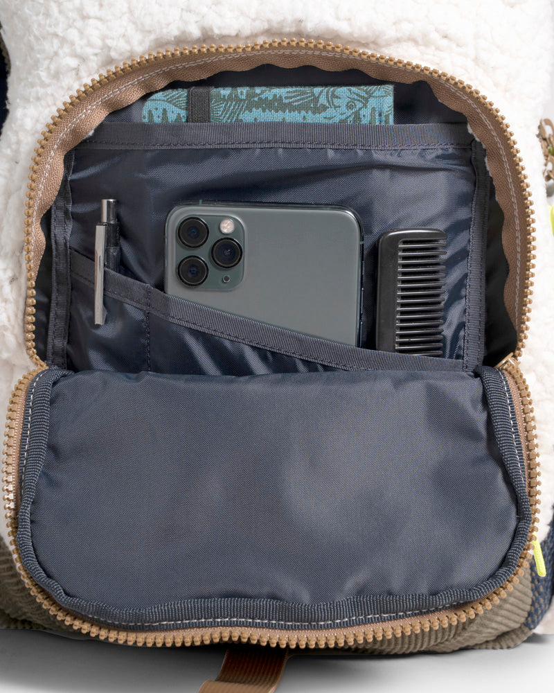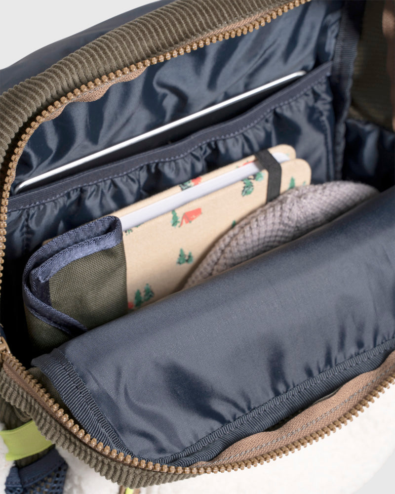 Get ready for some warm fuzzies. Our signature 9L Sidekick got a snuggly makeover with recycled sherpa and organic cotton corduroy accents. Perfect for everything from snowy hikes to daily errands.