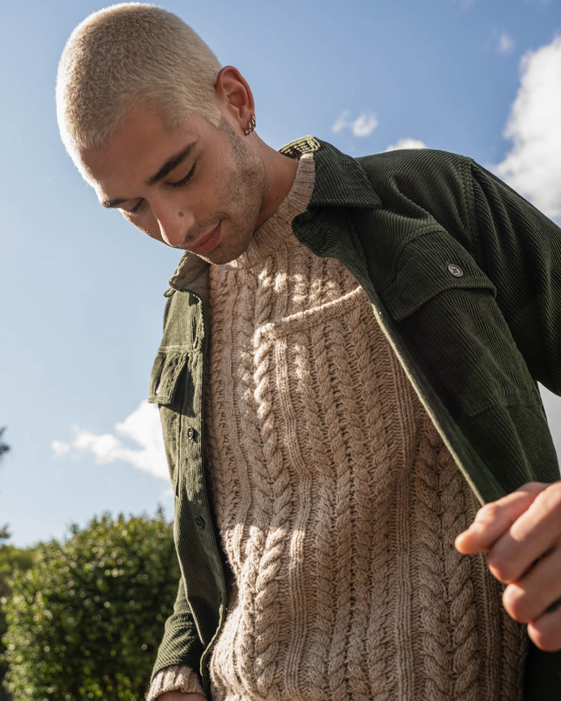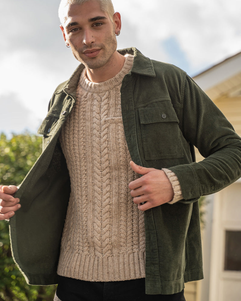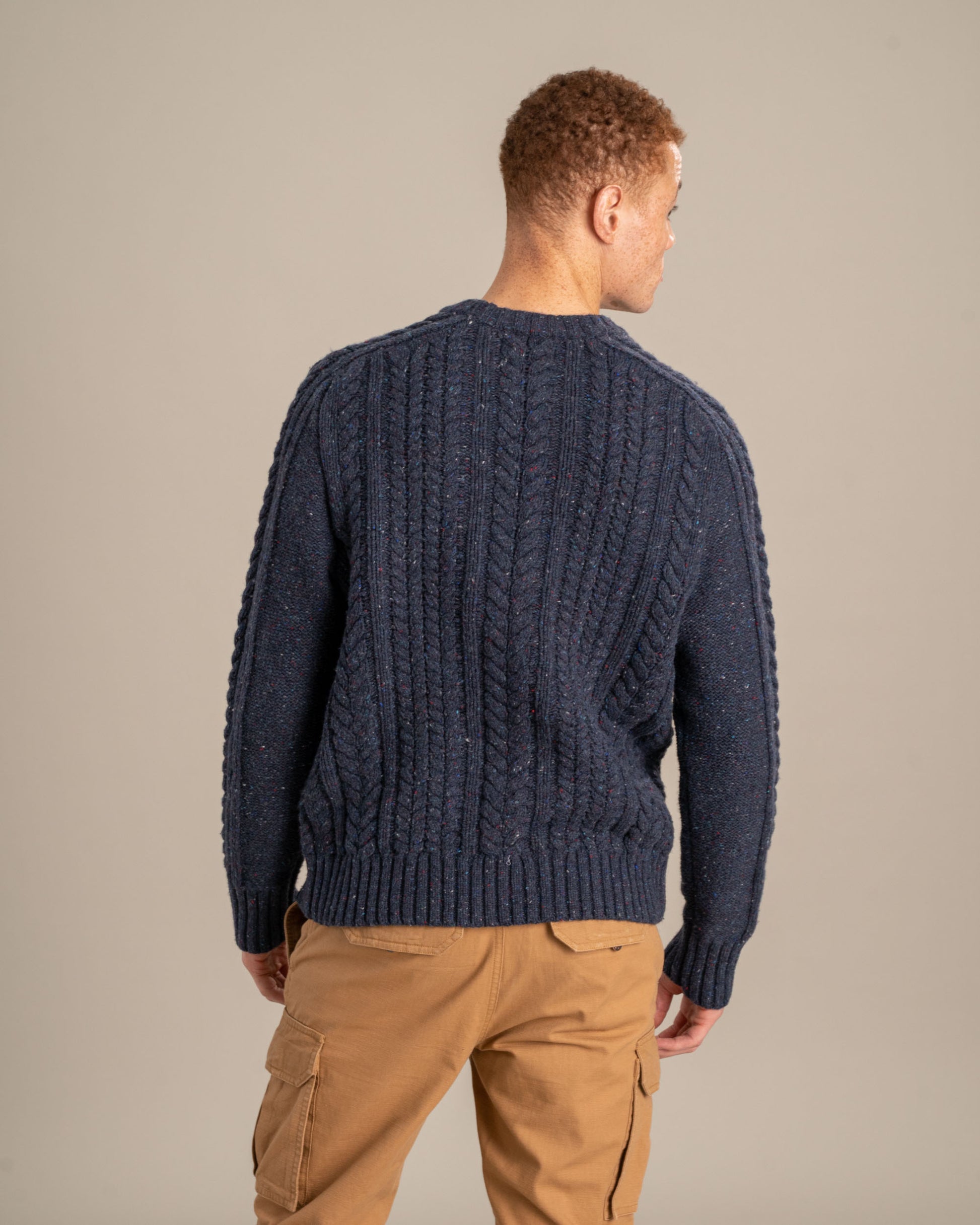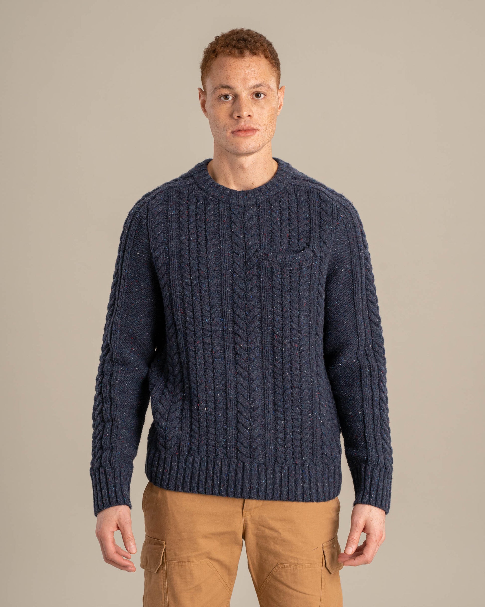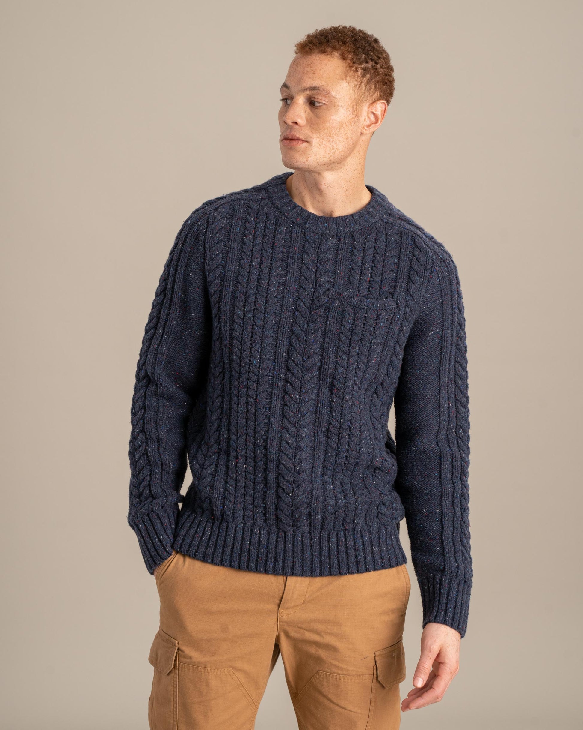 A classic cable knit sweater with a pocket on the chest. This wintertime staple is made with a wool blend for natural insulation on the coldest days.