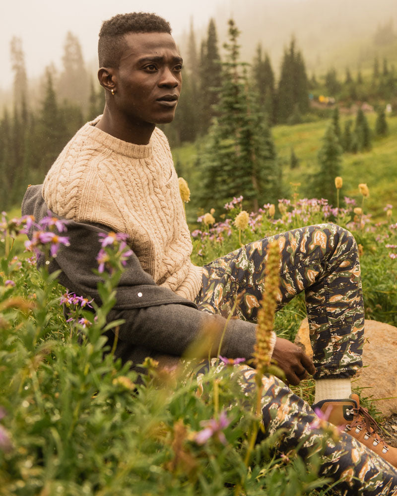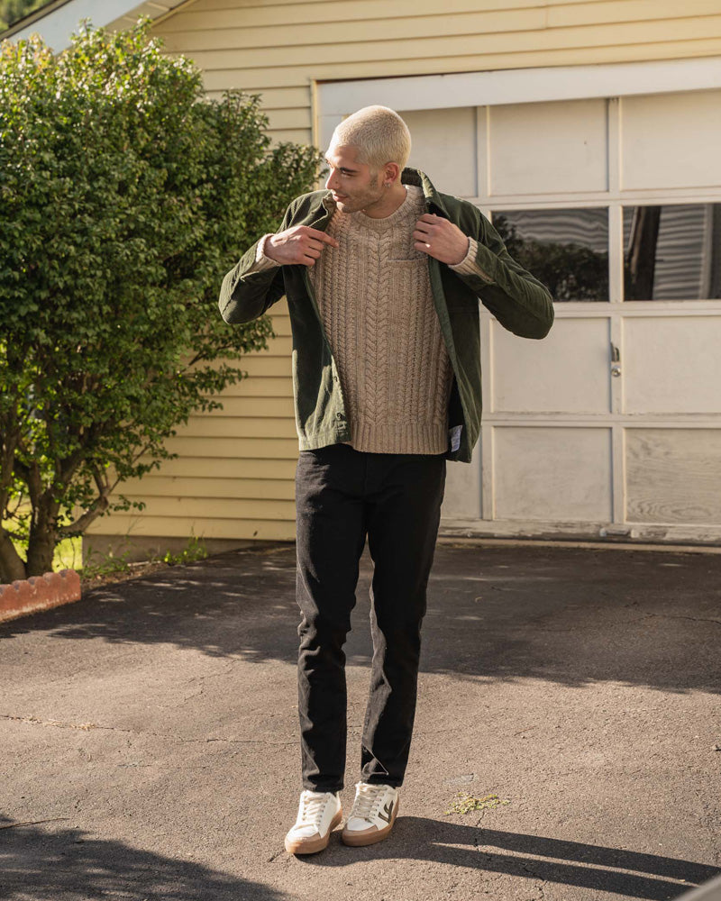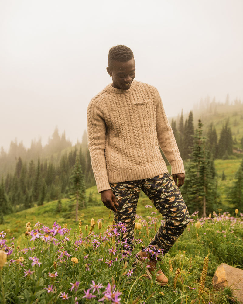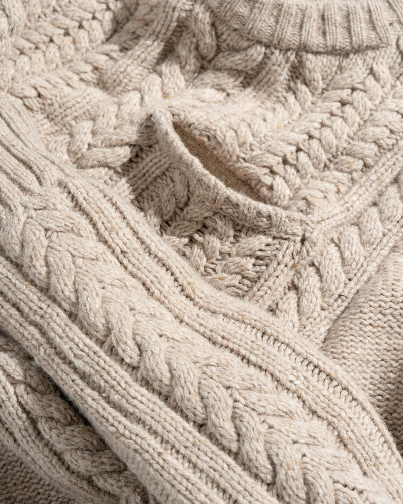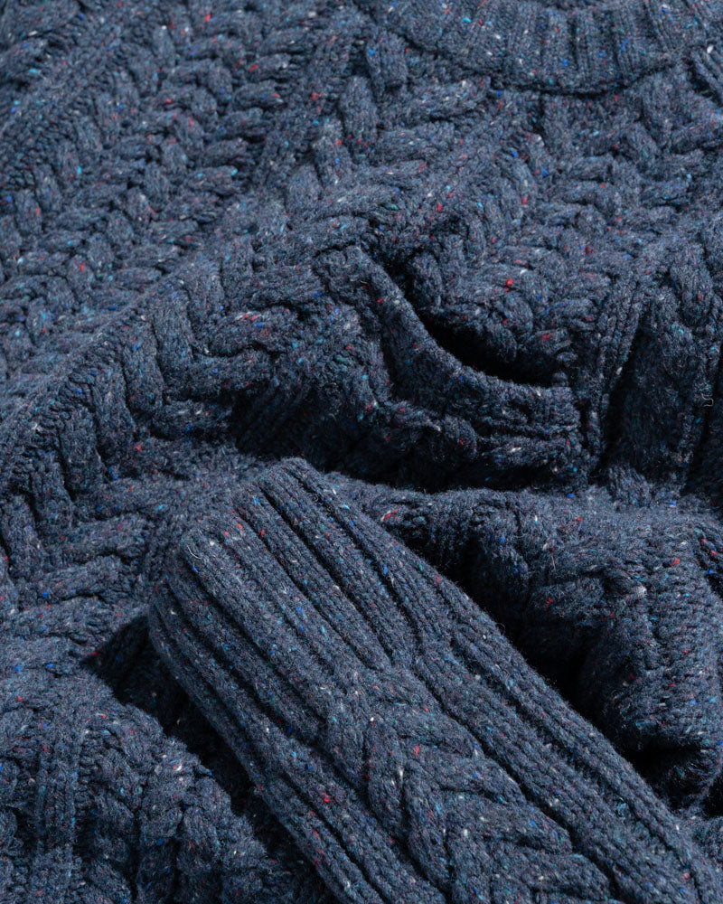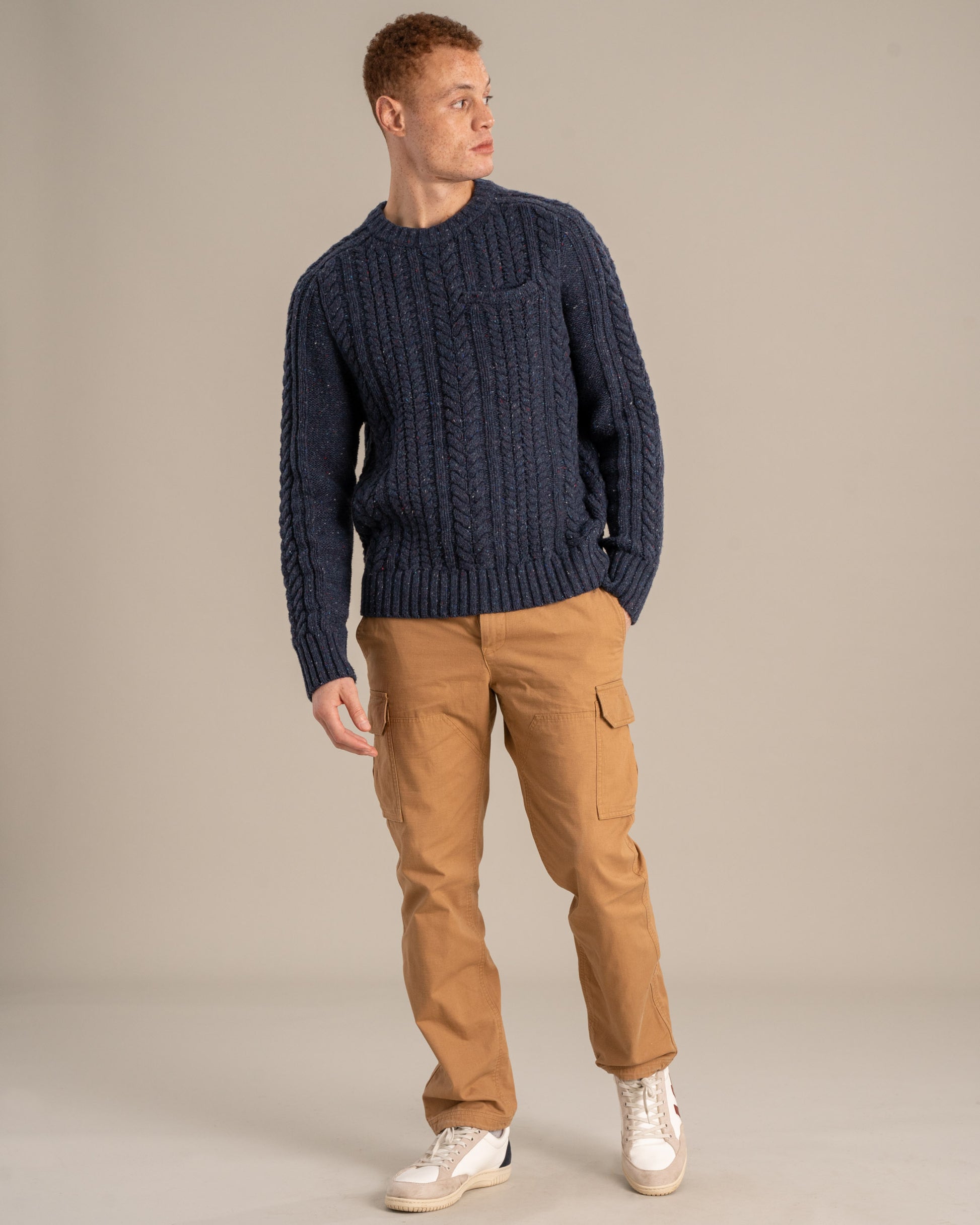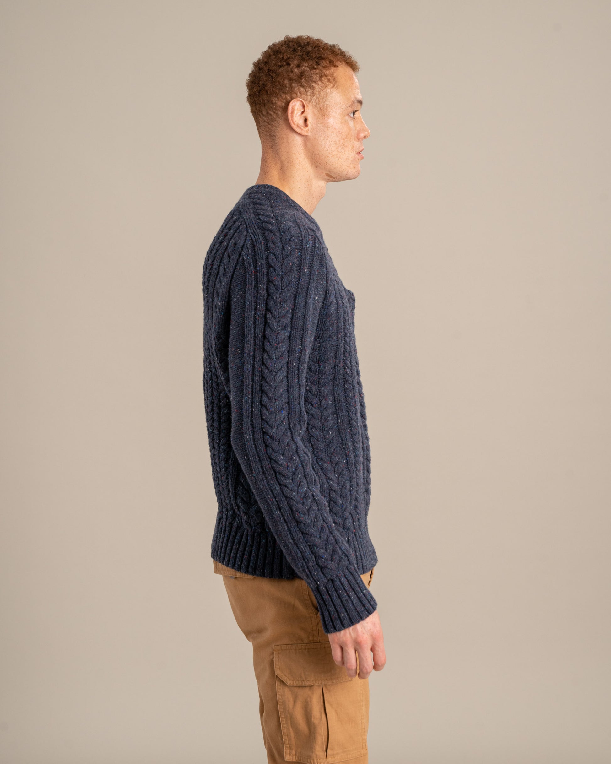 A classic cable knit sweater with a pocket on the chest. This wintertime staple is made with a wool blend for natural insulation on the coldest days.