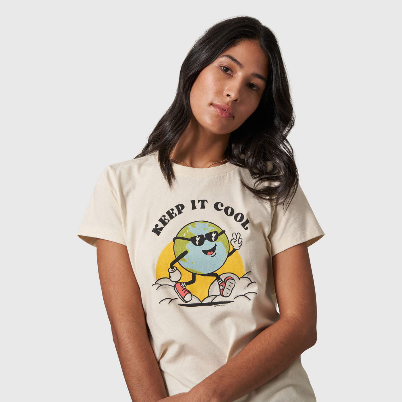 The Keep It Cool tee is a women's fit, short-sleeve t-shirt with a crew neckline and front graphic. It’s printed with a water-based ink and crafted from a blend of organic cotton and recycled polyester – a sustainable combination that conserves natural resources, keeps plastic waste out of landfills, and is especially soft to the touch. This responsibly-made piece is part of The United By Blue Impact Collection: an intentionally-designed capsule of sustainable goods at accessible price points – allowing us to reach more people and clean more trash than ever before. 1 product purchased = 1 pound of trash cleaned.