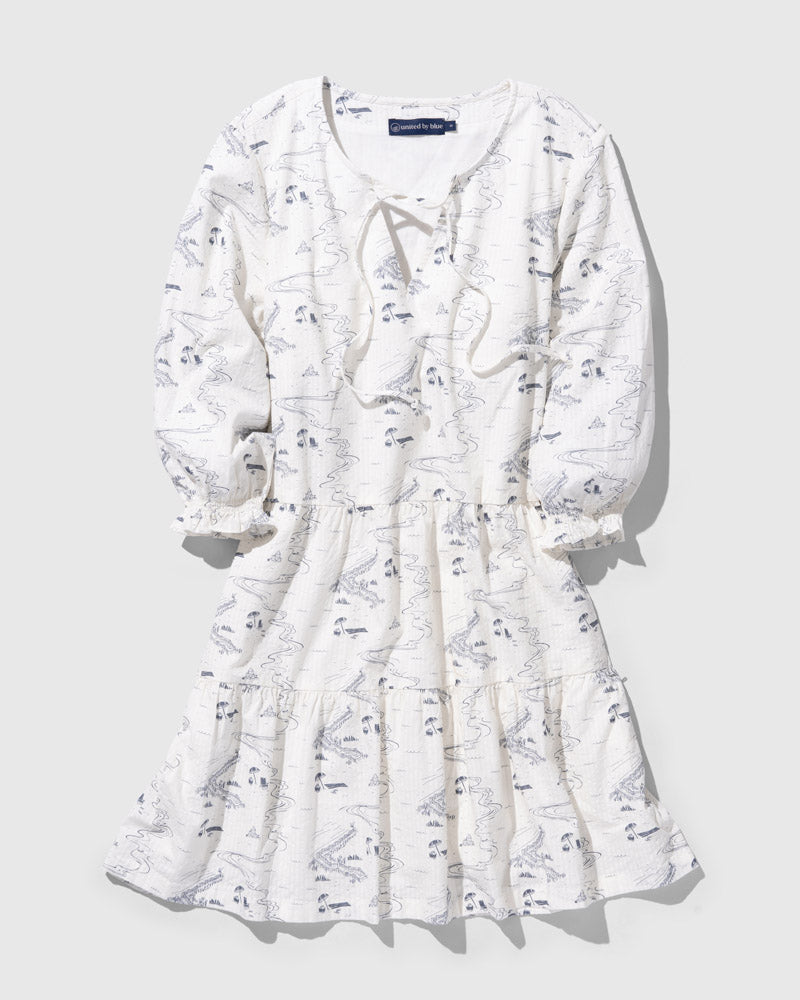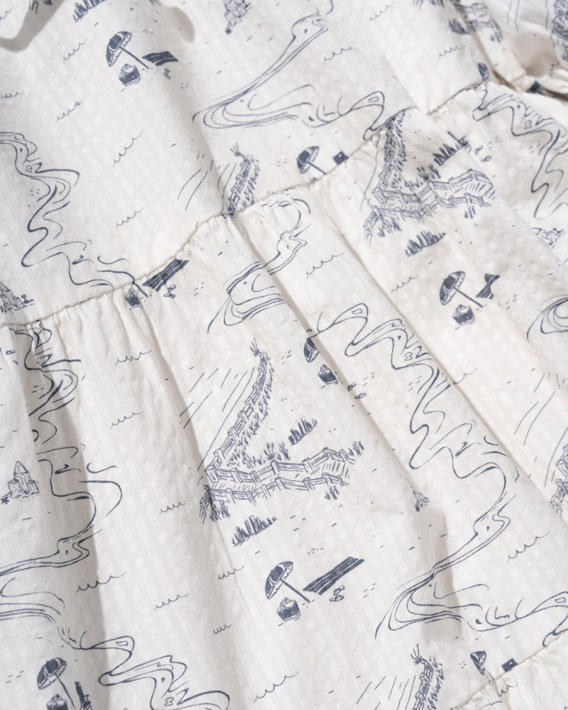 With airy sleeves, light and textured seersucker fabric, and an all-over beach print, this dress was made for summer. We fitted it with some extra, easygoing details like a self tie at the front and a touch of ruffles at the cuffs to add to the carefree look and feel.